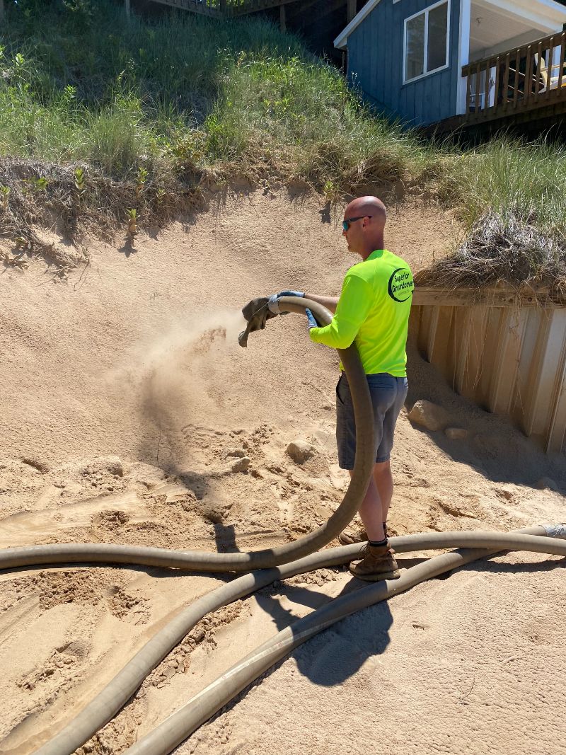 Sand is heavy and difficult to move by hand. DIY methods often lead to uneven depths, wasted material, and fatigue or injury risk. Our measured approach and blower equipment deliver uniform coverage in a fraction of the time so the site is filled properly and safely.